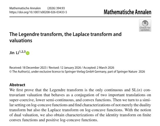 近日,理学院数学系凸几何团队李晋副教授在国际顶级综合数学期刊《Mathematische Annalen》(中国数学会-高质量科技期刊分级T1类期刊) 上发表题为 “The Legendre transform, the Laplace transform and valuations” 的重要研究论文。李晋副教授为论文唯一作者。上海大学为论文的第一完成单位和通讯单位。
