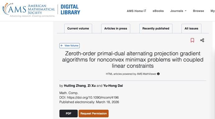 近日,理学院数学系徐姿教授与中国科学院张慧灵博士、戴彧虹院士合作,在美国数学学会期刊《Mathematics of Computation》在线发表题为 “Zeroth-Order Primal-Dual Alternating Projection Gradient Algorithms for Nonconvex Minimax Problems with Coupled Linear Constraints” 的重要研究论文。该论文以徐姿教授为唯一通讯作者,上海大学为通讯单位。